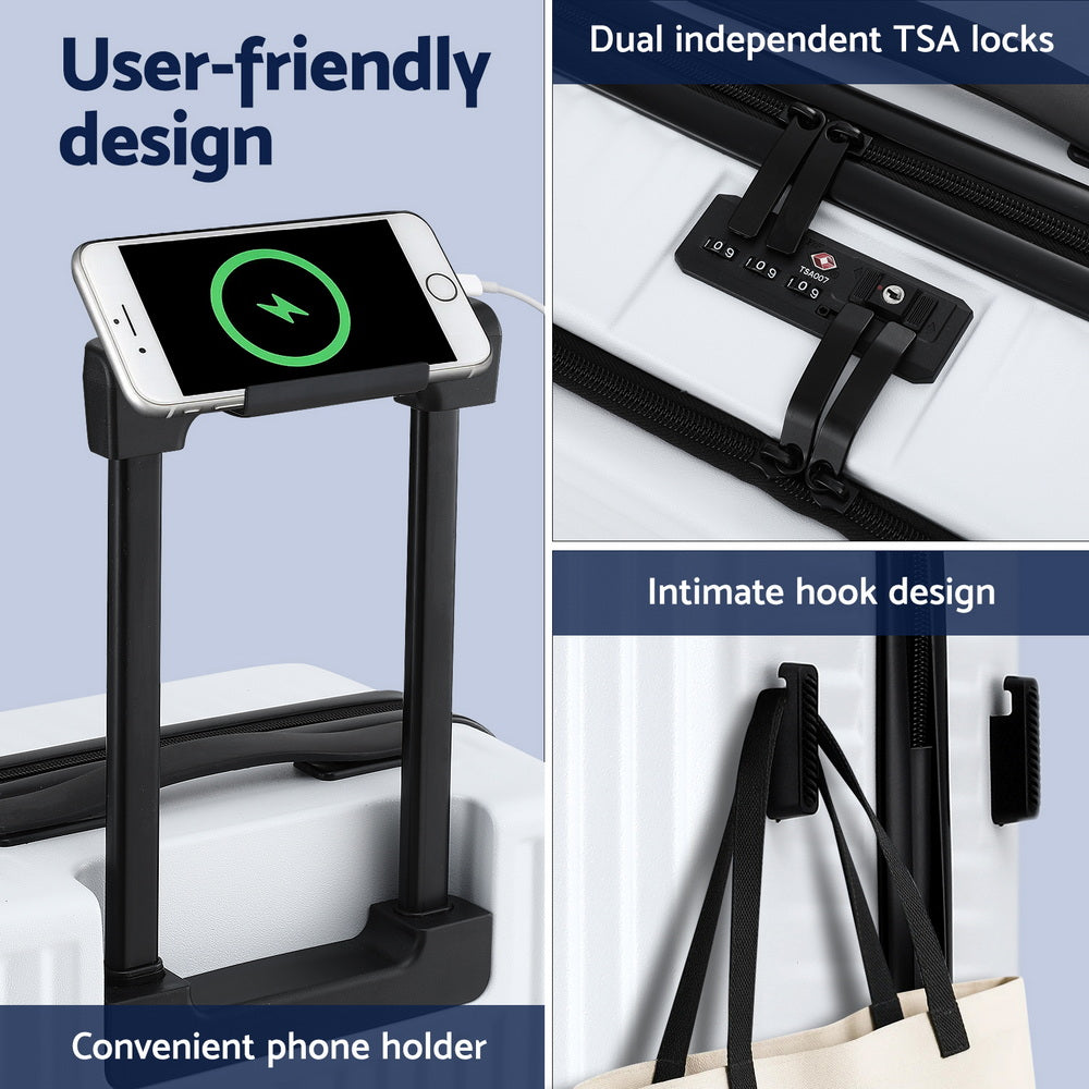 Features20" carry on front pocket luggage caseQuick-access laptop compartmentPremium ABS material with durable matte finishConvenient phone holderDual TSA-approved combination locksIntimate hook designBuilt-in retractable trolley systemSmooth 360�� dual spinner wheelsSpacious interior with elastic cross strapsDivider panel and multi-functional mesh pocketsTop and side carrying handles