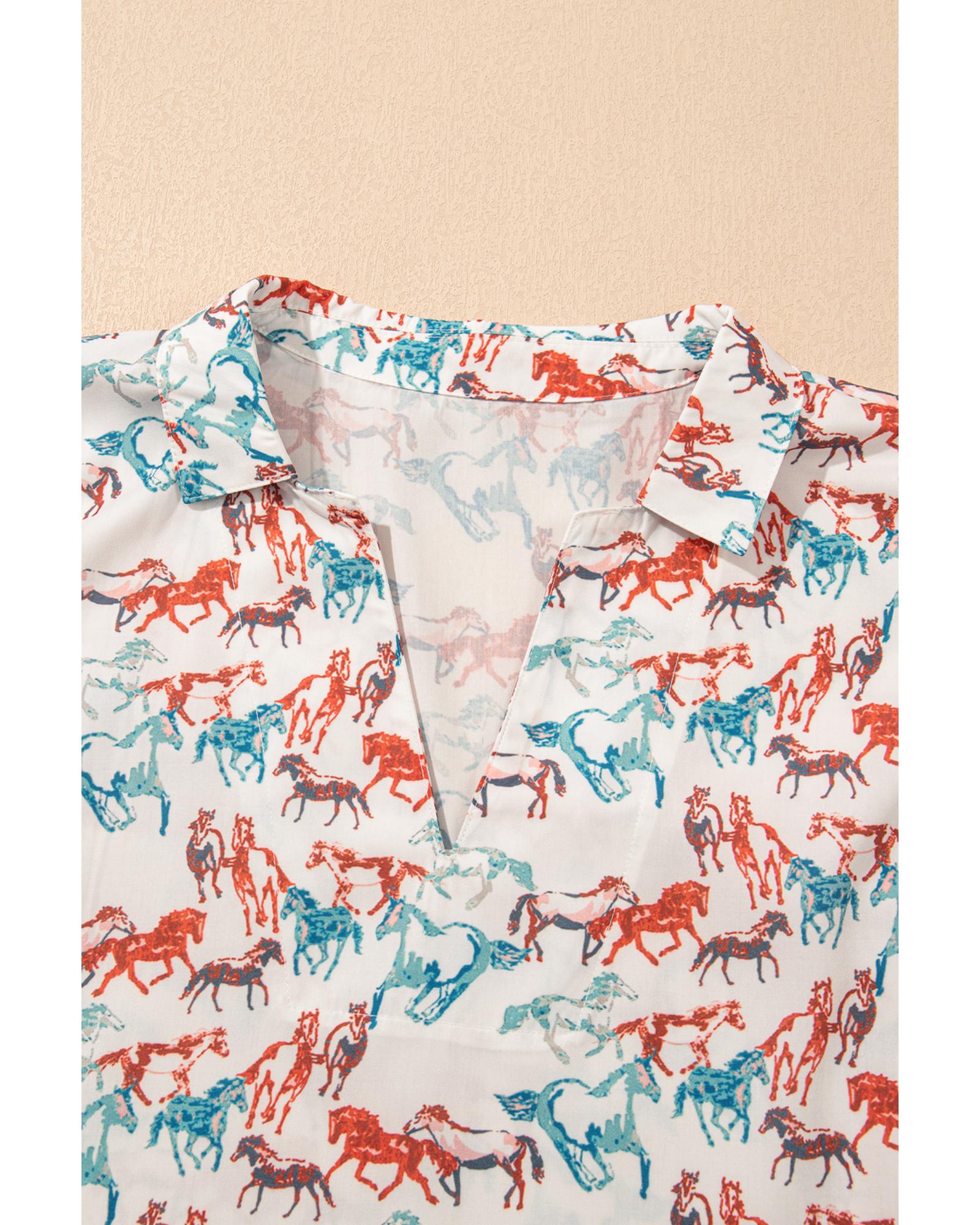 Add this beautiful white horse print blouse to your collection for an effortlessly chic and comfortable look.
