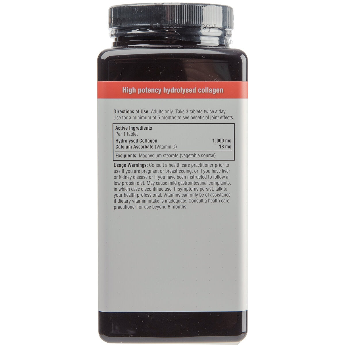 Hydrolyzed collagen (1,000 mg), calcium ascorbate (vitamin C) (18 mg). Excipients: magnesium stearate (vegetable source).